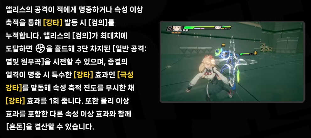 - 앨리스의 공격이 적 명중 시 [검의]가 누적되며, 앨리스가 속성 이상 축적으로 [강타] 발동 시 [검의]를 10pt 회복한다.