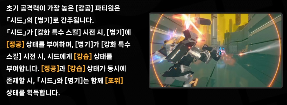 - 시드는 초기 공격력이 가장 높은 [강공] 파티원을 [병기]로 간주한다. - [병기]가 [강화 특수 스킬] 시전 시 시드가 [강습] 상태로 획득하며, 시드의 공격력 1000pt 및 치명타 피해 30%가 증가한다. - 시드가 [강화 특수 스킬] 시전 시 [병기]가 [정공] 상태를 획득하며, [병기]의 공격력 1000pt 및 치명타 피해 30%가 증가한다. - [정공]과 [강습]이 동시에 존재 시 시드와 [병기]가 동시에 [포위] 상태를 획득하고 주는 피해가 25% 증가한다. - [강습], [정공], [포위]의 버프 효과는 캐릭턱라 현재 조작 중인 캐릭터일 때 적용되며, 캐릭터 교체 시 해당 버프 효과는 캐릭터가 전장에서 퇴장하거나 버프 효과가 3초 유지된 후 사라진다. - 전장 진입 시 [병기]가 존재하면, 시드는 즉시 [강습] 및 [포위] 상태를 획득하며, [병기]는 즉시 [정공] 및 [포위] 상태를 획득한다. - [정공] 및 [강습] 상태 지속 시간 : 40초 - 중복 획득 시 지속 시간이 갱신된다. - [병기]가 조작 중인 케릭터로서 에너지를 소모하거나 시드가 에너지를 소모할 시, 소모한 에너지 1pt마다 시드가 [강철 에너지]를 0.5pt 회복한다. |