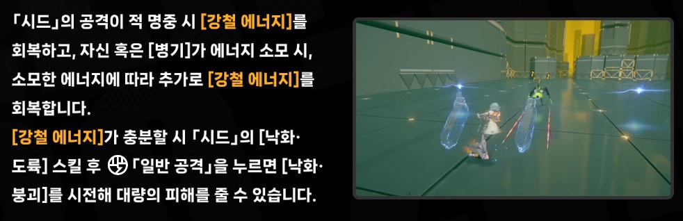 - 시드는 초기 공격력이 가장 높은 [강공] 파티원을 [병기]로 간주한다. - [병기]가 [강화 특수 스킬] 시전 시 시드가 [강습] 상태로 획득하며, 시드의 공격력 600pt 및 치명타 피해 25%가 증가한다. - 시드가 [강화 특수 스킬] 시전 시 [병기]가 [정공] 상태를 획득하며, [병기]의 공격력 600pt 및 치명타 피해 25%가 증가한다. - [정공]과 [강습]이 동시에 존재 시 시드와 [병기]가 동시에 [포위] 상태를 획득하고 주는 피해가 20.5% 증가한다. - [강습], [정공], [포위]의 버프 효과는 캐릭턱라 현재 조작 중인 캐릭터일 때 적용되며, 캐릭터 교체 시 해당 버프 효과는 캐릭터가 전장에서 퇴장하거나 버프 효과가 3초 유지된 후 사라진다. - 전장 진입 시 [병기]가 존재하면, 시드는 즉시 [강습] 및 [포위] 상태를 획득하며, [병기]는 즉시 [정공] 및 [포위] 상태를 획득한다. - [정공] 및 [강습] 상태 지속 시간 : 40초 - 중복 획득 시 지속 시간이 갱신된다. - [병기]가 조작 중인 케릭터로서 에너지를 소모하거나 시드가 에너지를 소모할 시, 소모한 에너지 1pt마다 시드가 [강철 에너지]를 0.5pt 회복한다. |
