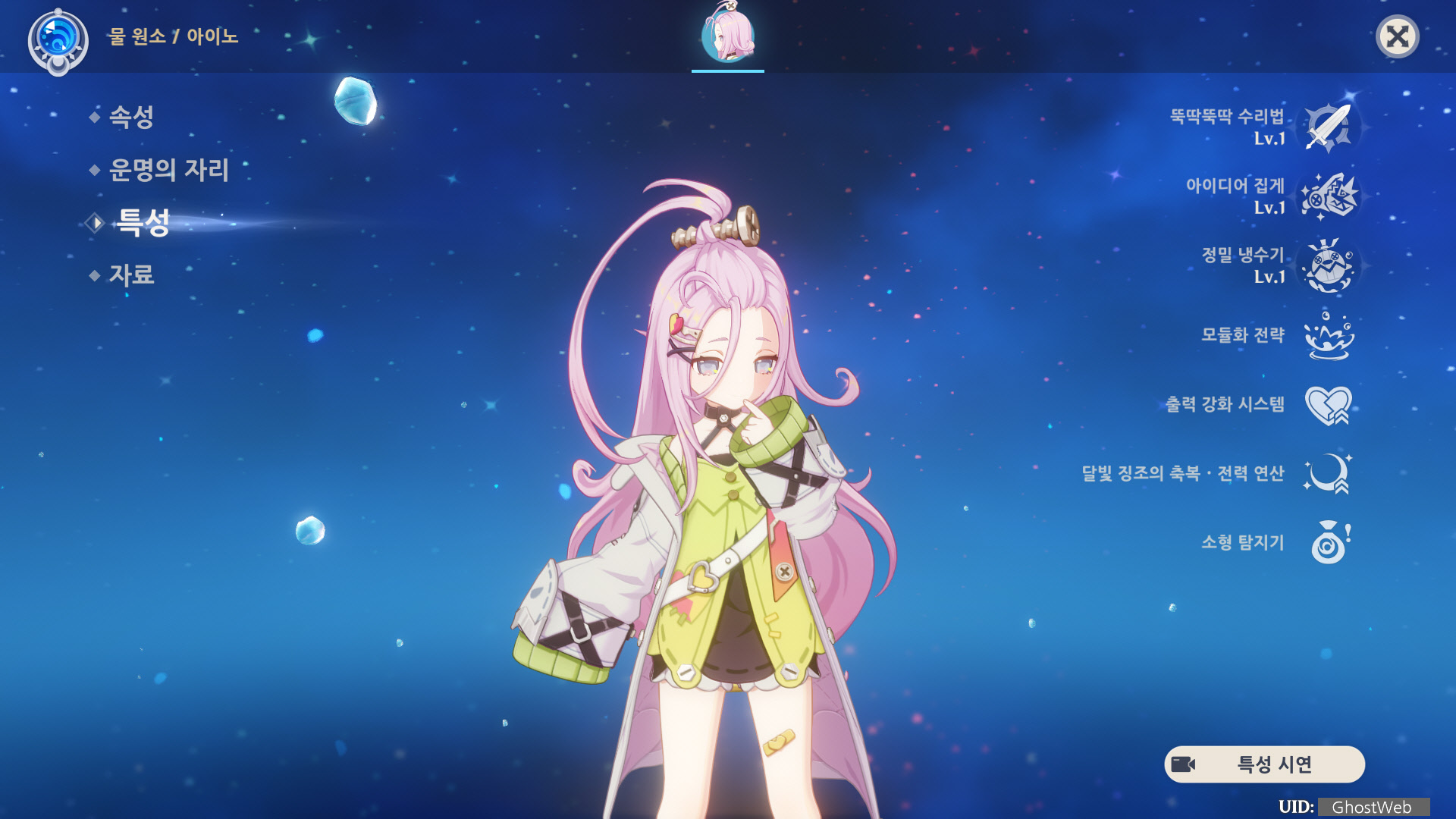 - 원소전투 스킬 아이디어 집게가 적에게 명중 시, 아이노의 원소 에너지가 10pt 회복된다.