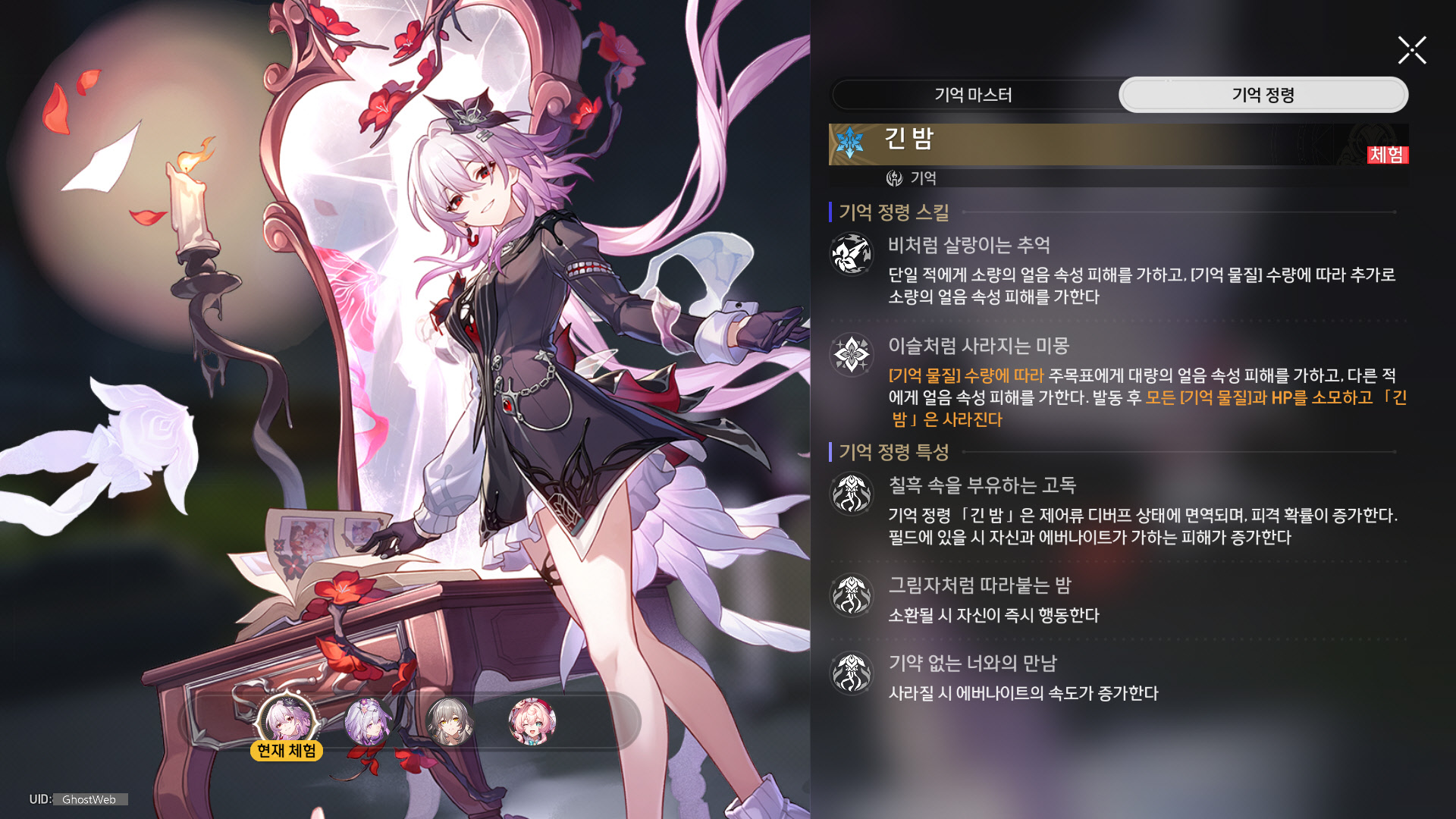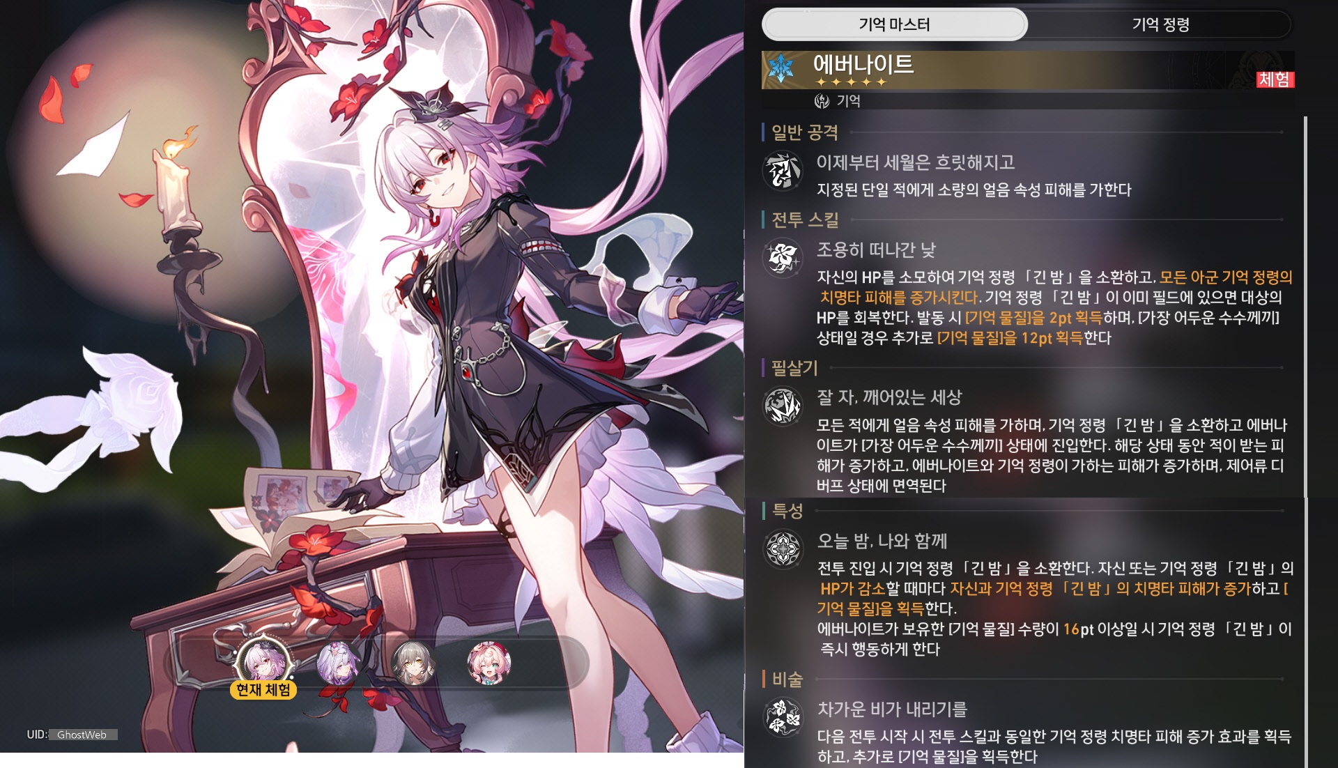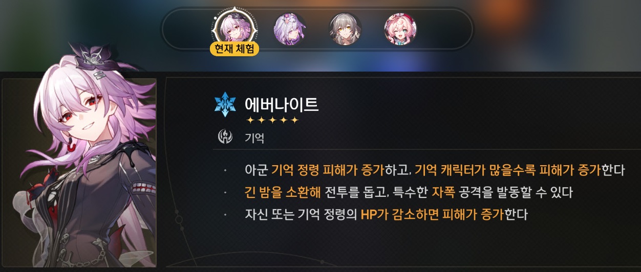 | 6 | 그냥 이대로, 계속 | 에버나이트가 필드에 있을 시 모든 아군의 모든 속성 저항 관통이 20% 증가한다. 기억 정령 [긴 밤] 이 [이슬처럼 사라지는 미몽]을 발동하면 에버나이트는 이번 공격으로 소모한 [기억 물질] 수량의 30%를 획득한다. |