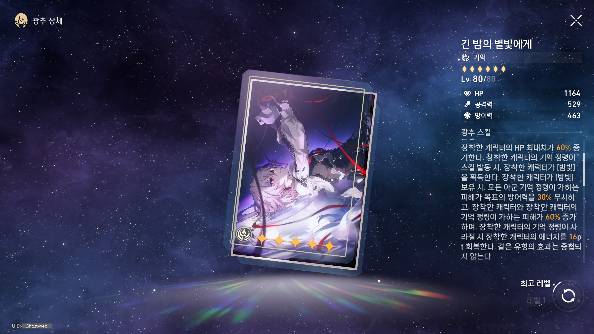 | 0-1 | 칠흑 속을 부유하는 고독 (기억 정령 특성) |