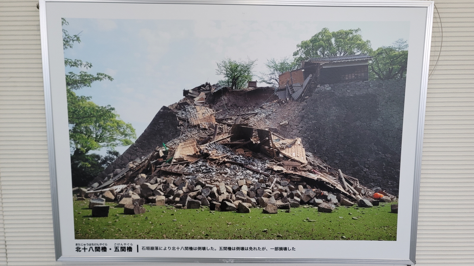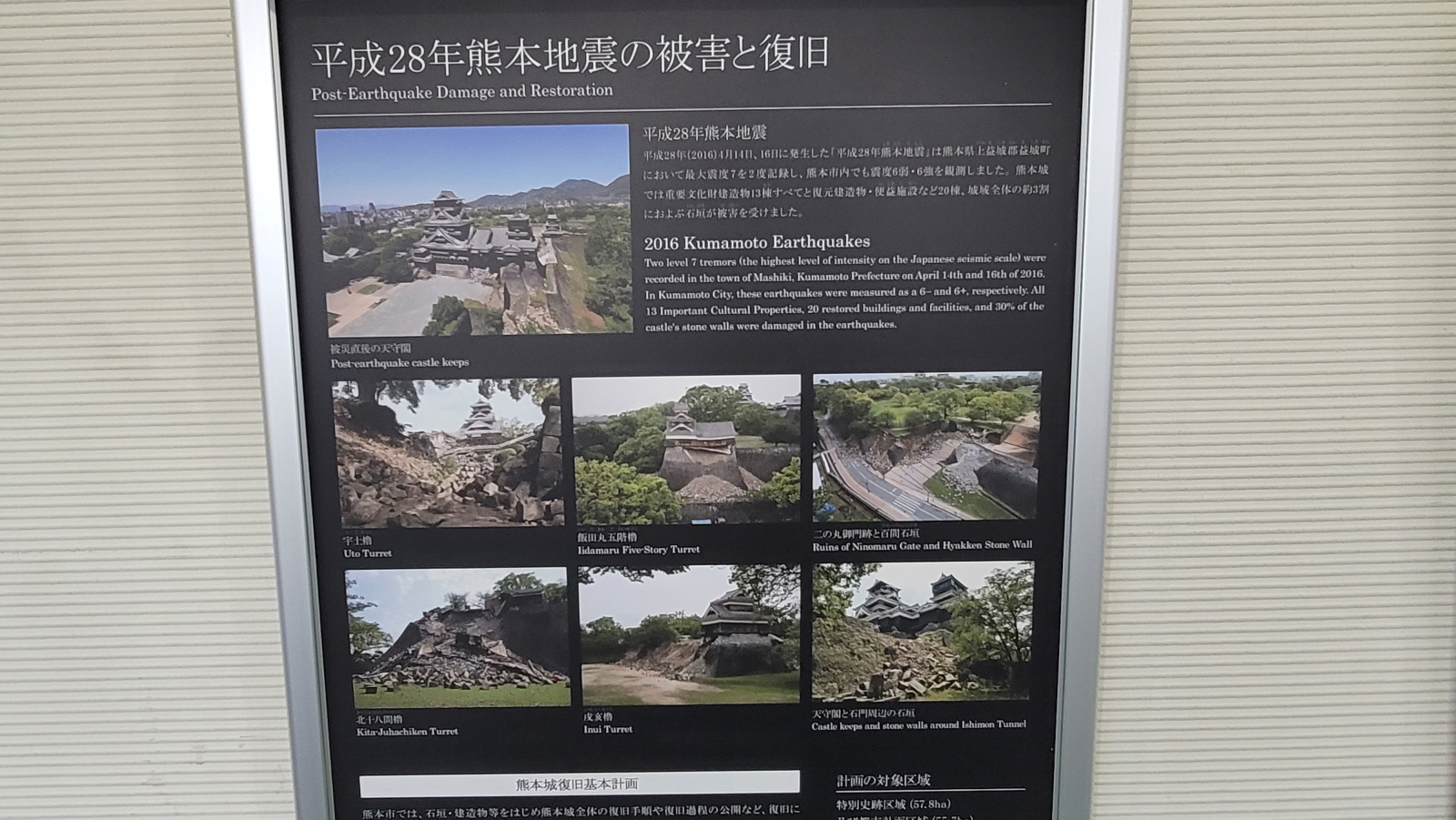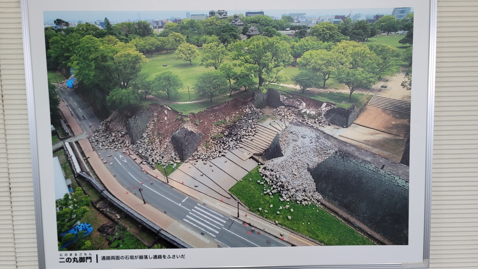 내부에는 2016년 지진으로 인해 구마모토 성벽 들이 붕괴된 모습들을 볼 수 있어요.