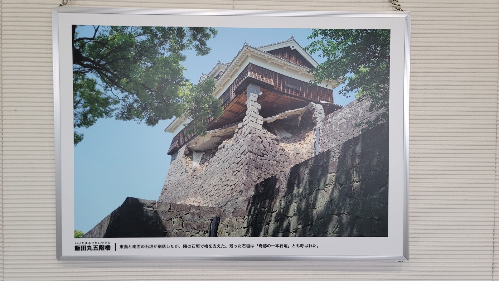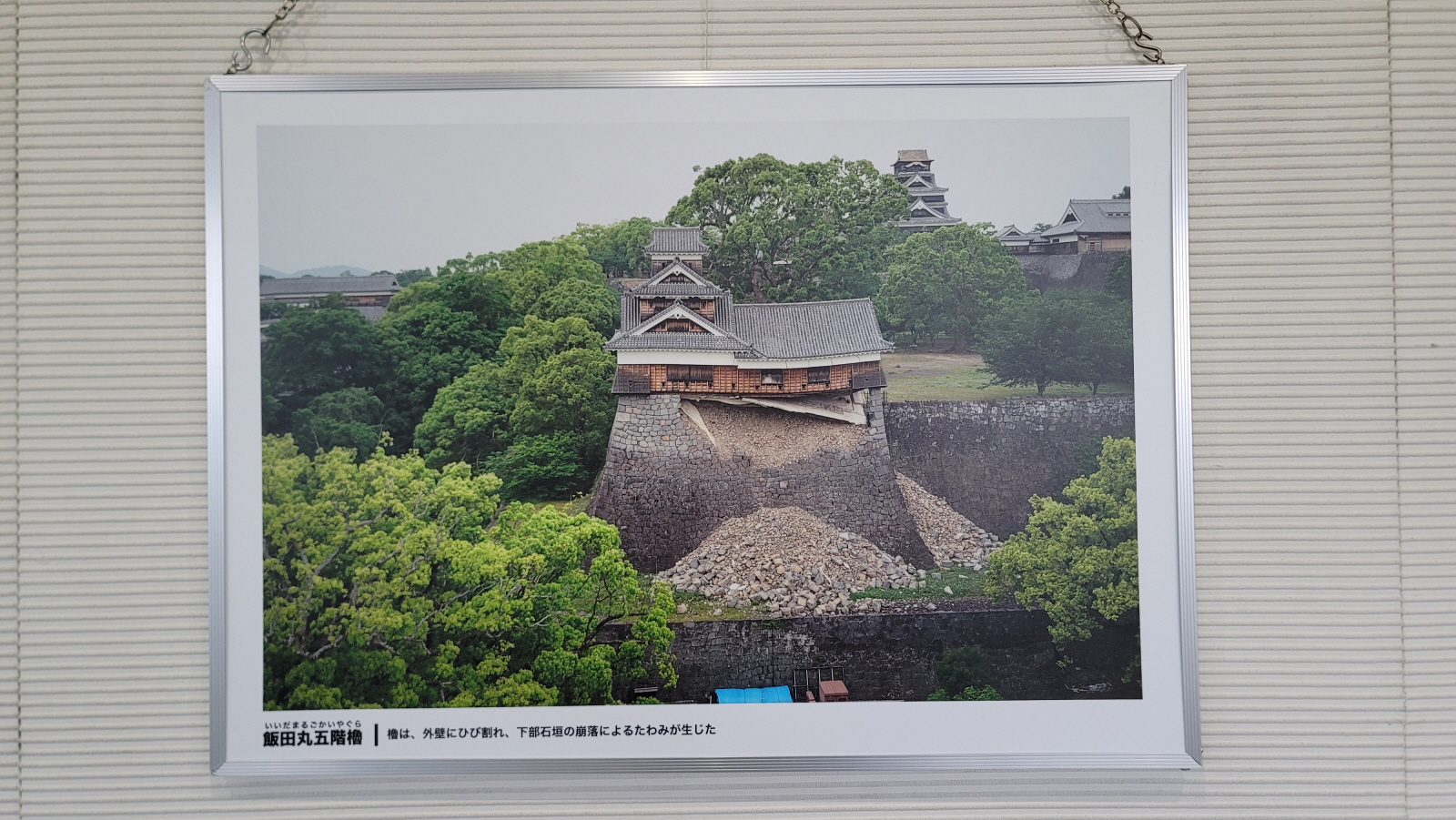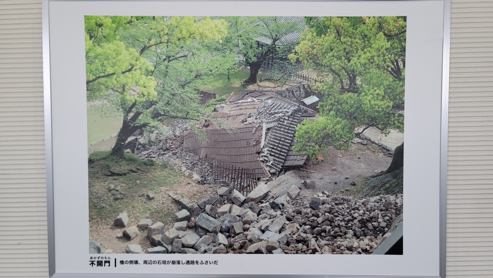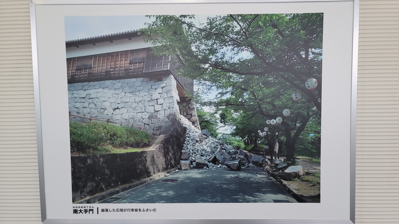 내부에는 2016년 지진으로 인해 구마모토 성벽 들이 붕괴된 모습들을 볼 수 있어요.