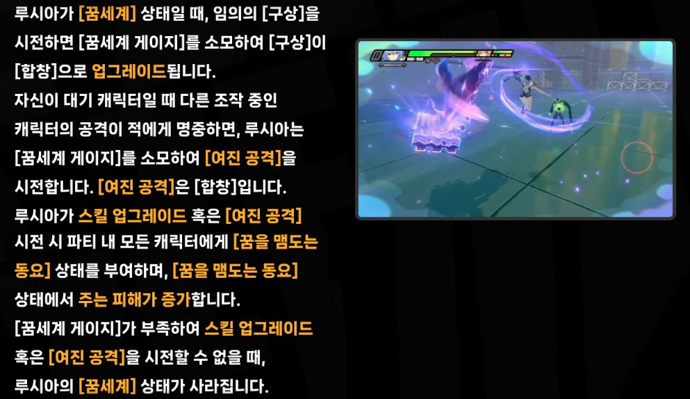 - [꿈세계] 상태가 아닐 때, 루시아가 해당 [구상]을 시전하면 [꿈세계 게이지]를 20pt 획득하며, 5초 동안 최대 1회 획득할 수 있다.