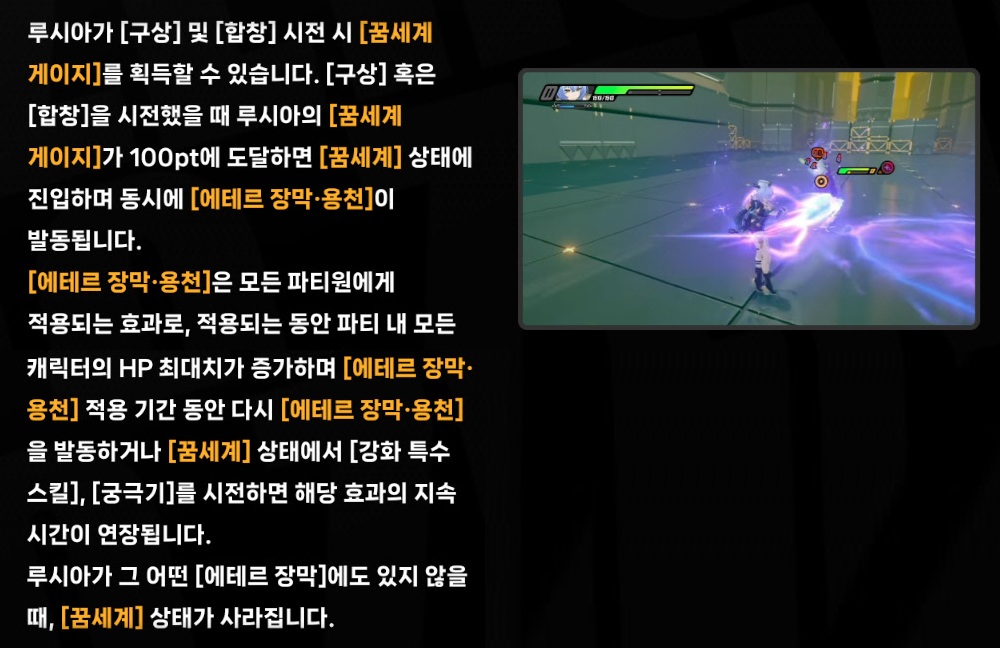- 루시아가 강화 특수 스킬을 시전한 후, 자신의 꿈세계 상태이고 [에테르 장막 · 용천]이 적용 중이라면 [에테르 장막 · 용천]의 지속 시간이 16초 연장된다.