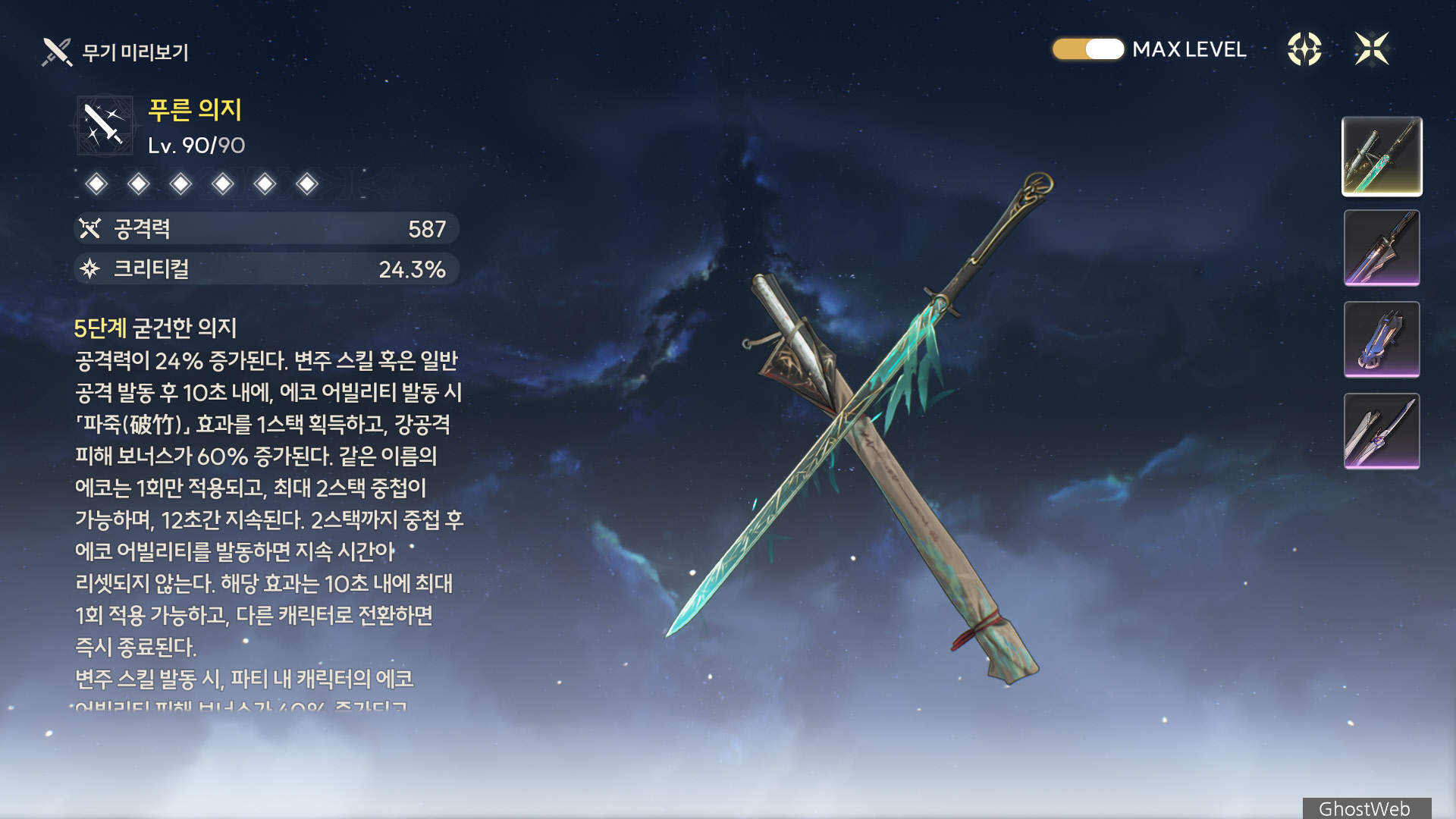 · 일반 공격 검의 회답 · 어둠 속 푸른 빛 각 단을 발동할 시 검의 독백 100pt를 획득한다.