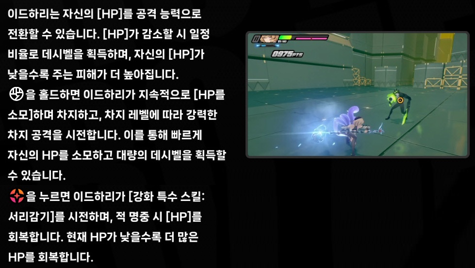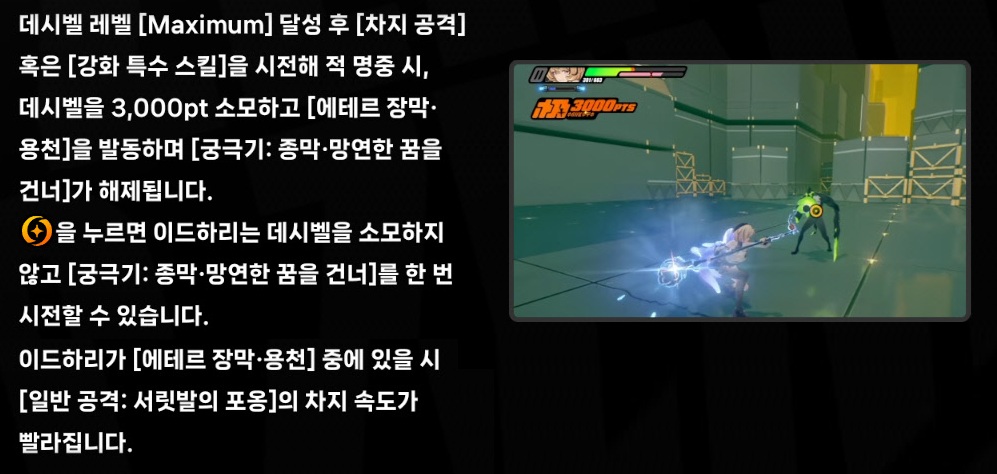 - 이드하리는 스킬 명중 시 얻는 데시벨이 감소하며, 이드하리 HP가 감소할 때 데시벨을 획득한다.
