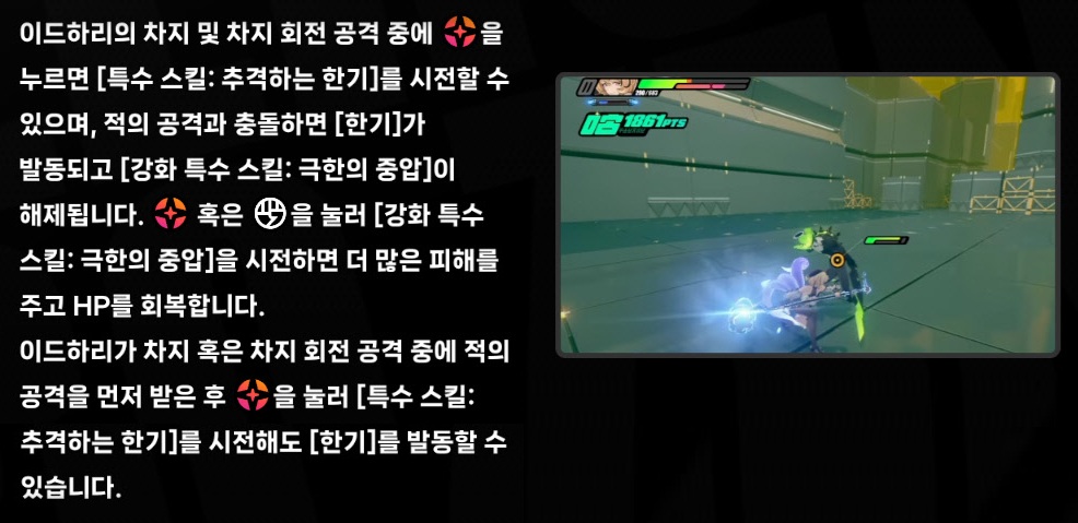 - 이드하리의 HP가 많을 수록 차지 시 HP 소모 속도가 더 빨라지며, 최대 HP 최대치의 25%까지 소모된다.