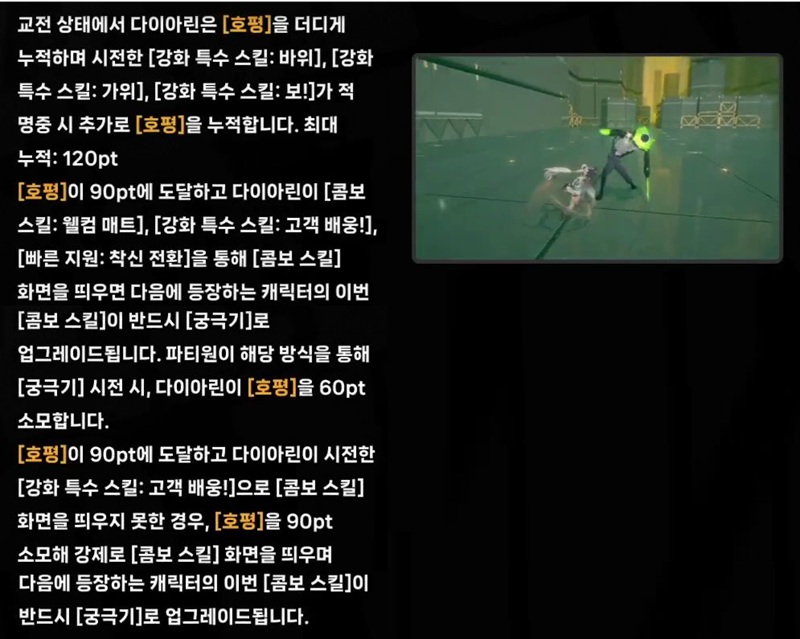 - [호평] 90pt에 도달한 다이아린이 [콤보 스킬: 웰컴 매트], [강화 특수 스킬: 고객 배웅!], [빠른 지원: 착신 전환]으로 [콤보 스킬] 창을 띄우면, 다음으로 등장하는 캐릭터의 이번 [콤보 스킬]이 강제로 [궁극기]로 업그레이드 된다.