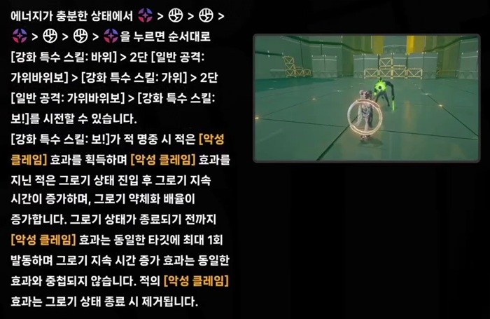 - [강화 특수 스킬: 바위] 시전 후, 다음에 시전하는 [강화 특수 스킬]이 [강화 특수 스킬: 가위]로 변경되며, 8초간 지속된다.