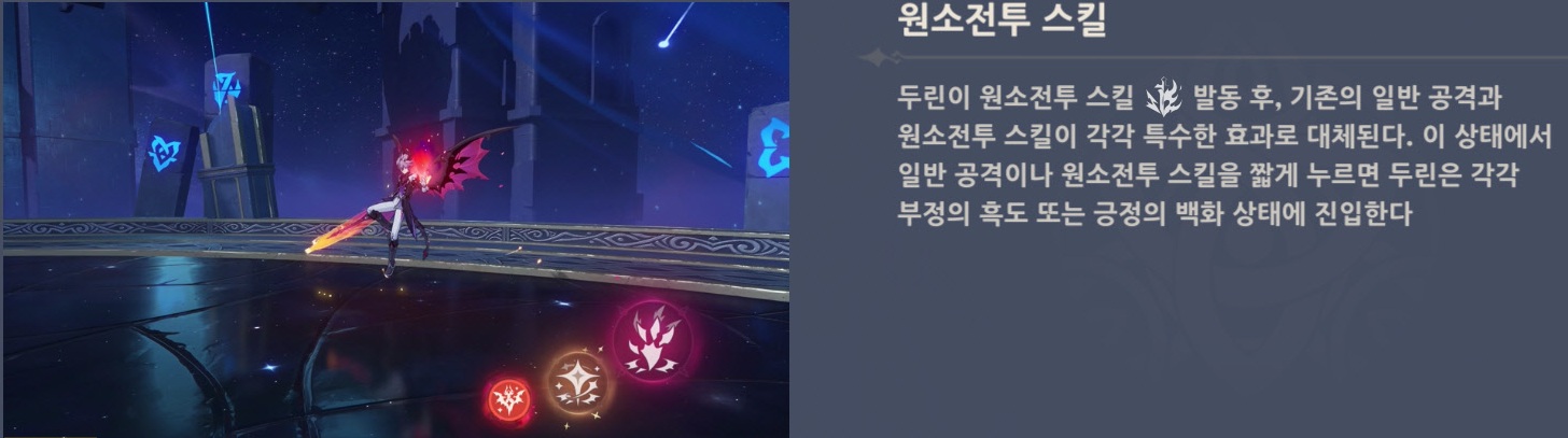 - 두린의 본질 전환 상태에 따라 다른 원소폭발을 발동할 수 있다.
