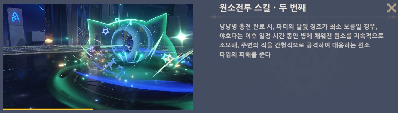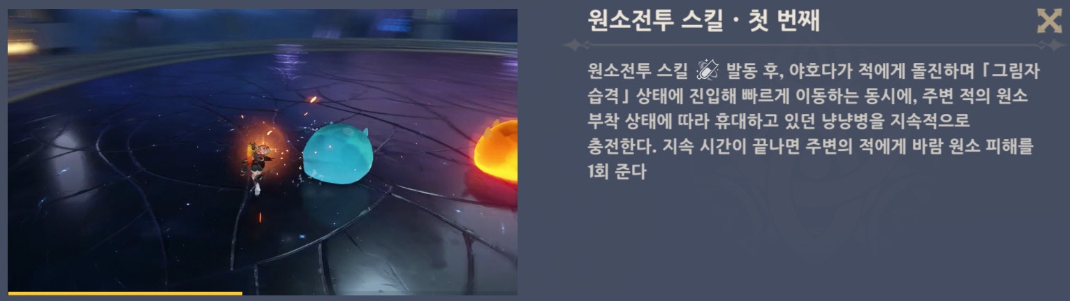 - 주변의 적이 불 원소, 물 원소, 번개 원소 또는 얼음 원소 부착 상태일 경우, 야호다는 몰래 가지고 있던 냥냥병을 대응하는 원소 속성으로 전환한 후 지속적으로 병을 충전한다.
