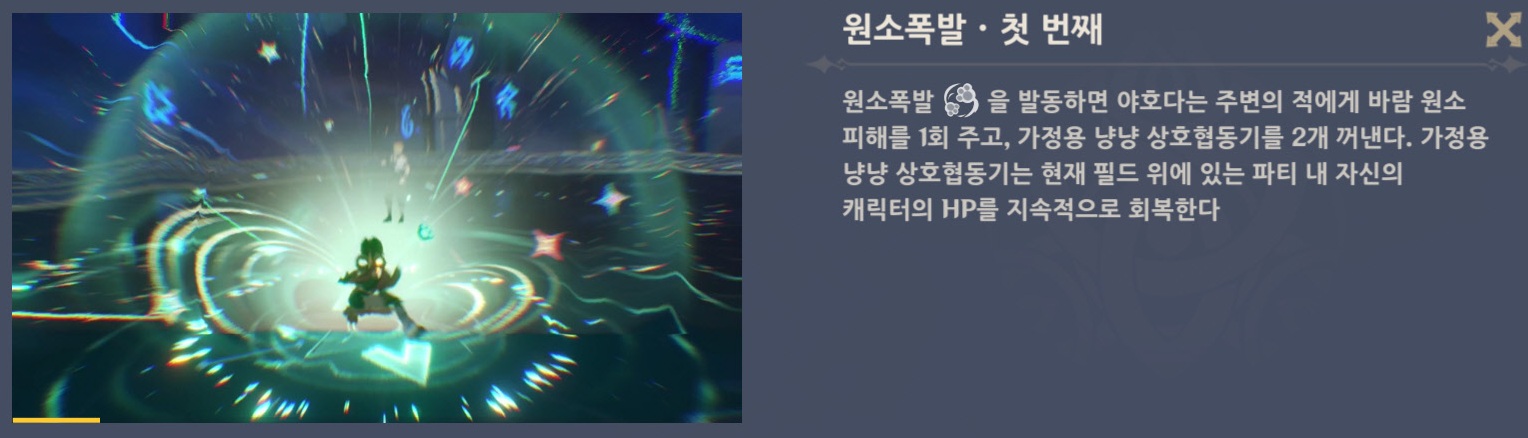 - 원소폭발 비기 · 사냥꾼의 일곱 도구의 가정용 냥냥 상호협동기에 원소 전환이 발생 시, 야호다의 원소 에너지가 4pt 회복된다.