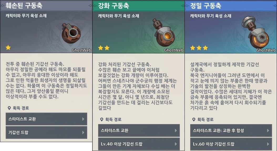- 훼손된 구동축, 강화 구동축, 정밀 구동축 (노드크라이 - 기갑선 처치)