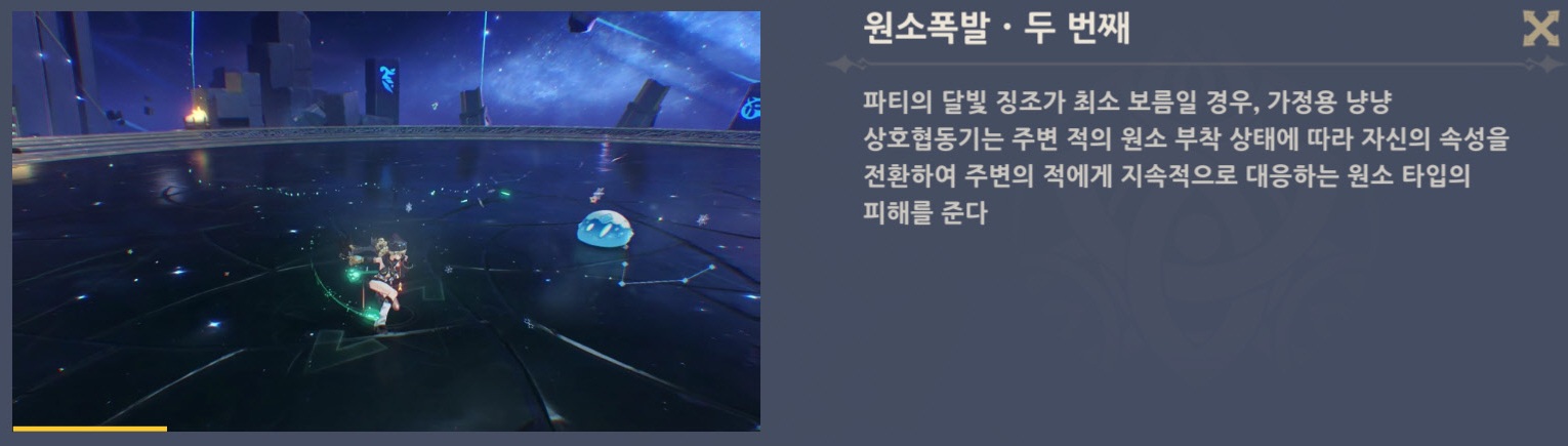 - 파티에 불 원소, 물 원소, 번개 원소 또는 얼음 원소 타입의 캐릭터가 1명 이상 존재할 경우, 대응하는 원소 타입 캐릭터의 수량에 따라 원소폭발 비기 · 사냥꾼의 일곱 도구의 가정용 냥냥 상호협동기가 강화된다.