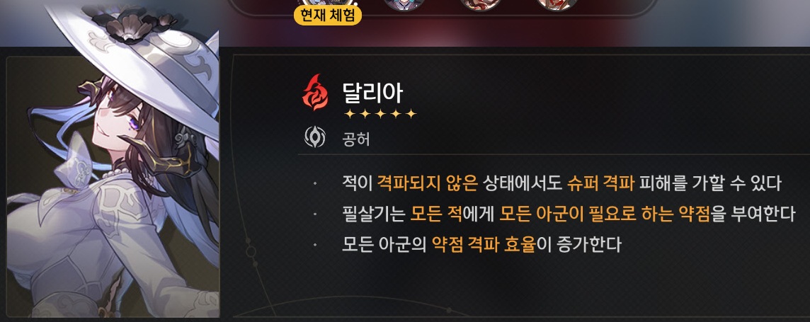 - 전투 진입 시 다른 캐릭터의 격파 특수 효과가 달리아 격파 특수효과의 24%에 50%를 더한 값만큼 증가한다. - 지속 시간 : 1턴 - 달리아가 동료가 제공하는 치유 효과 또는 실드를 받으면 해당 효과가 재발동한다. - 지속 시간 : 3턴 - 해당 효과는 단일 턴 내에 중복 발동하지 않는다. |