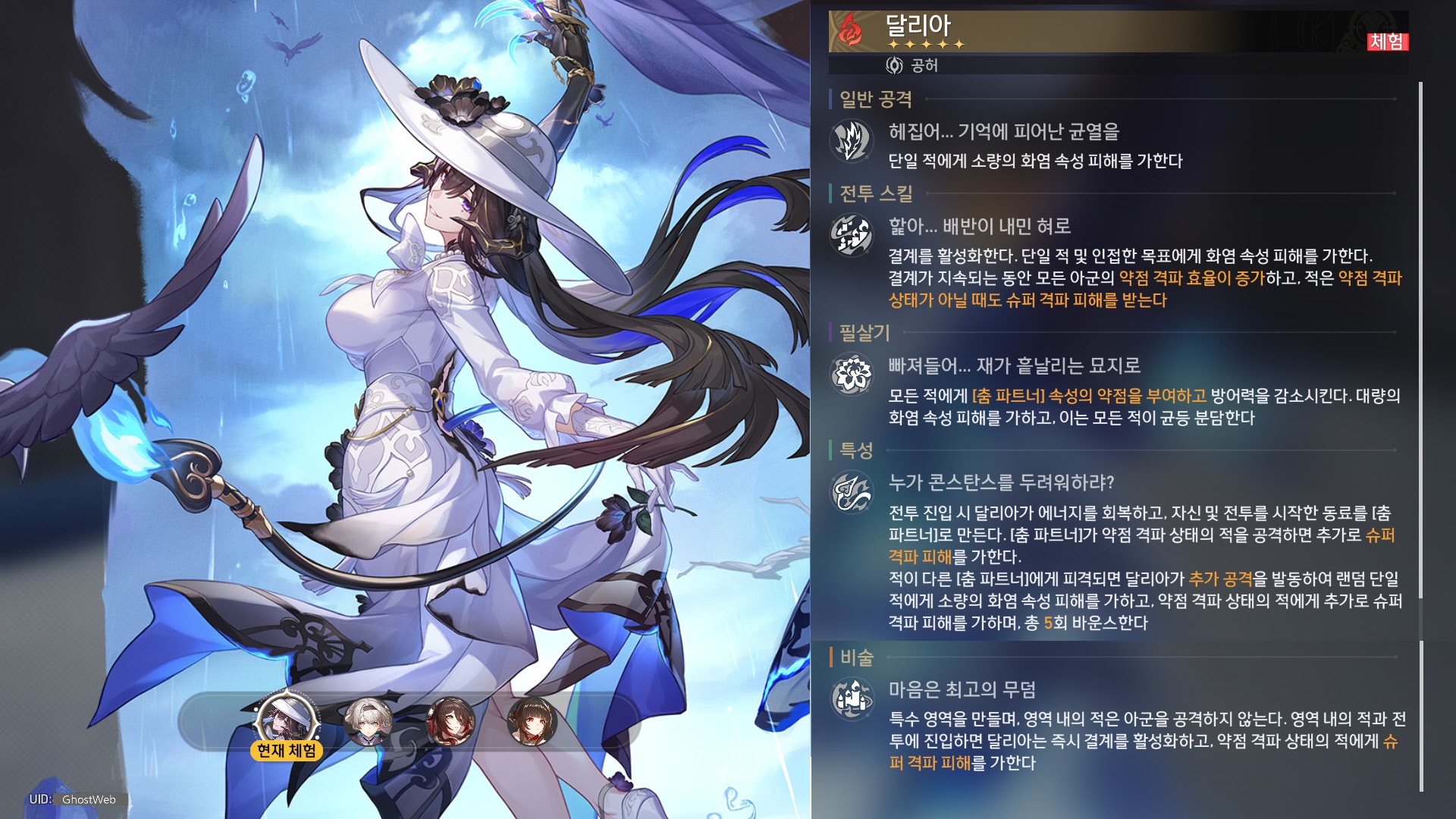 - 적이 다른 [춤 파트너]에게 피격되면 달리아가 추가 공격을 발동하고, 피해를 5회 가하며, 회당 랜덤 단일 적에게 달리아 공격력의 15%만큼 화염 속성 피해를 가한다.
