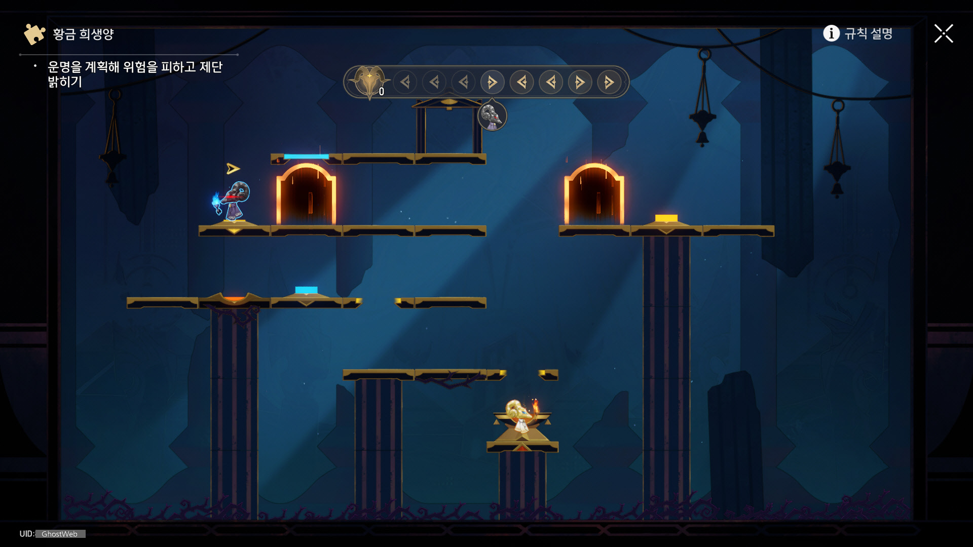 그리고 왼쪽에 철창에 잠겨 있는 전리품은 자그레우스의 손을 조종하여 12시 방향에 있는 슬롯들을 꽂아주고 손을 조정하는 곳에 있는 2층의 룬 4개를 1층에 있는 룬과 동일하게 만들어 주면 돼요. (자그레우스 손으로 기둥을 공격하여 룬 모양 변경하기)