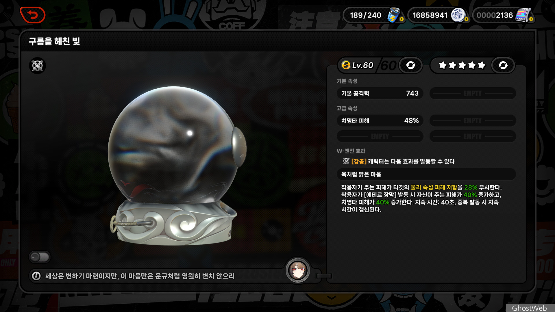 | E | 치명타 확률 4.8% 증가 [핵심 패시브: 무명 타파] 스킬 레벨 + 1 |