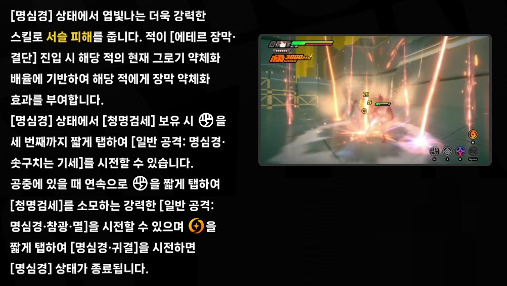 - [명심경] 상태에서 [극한 회피] 발동 시 일반 공격 버튼을 눌러 [일반 공격: 명심경·솟구치는 기세]를 시전할 수 있다.