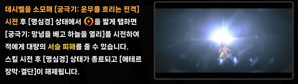 - 데시벨을 소모하여 [궁극기: 운무를 흐리는 전격] 시전 후 [명심경] 상태에서 궁극기 버튼을 짧게 탭하거나 [청명검세]가 소진된 후 충전된 특수 스킬 버튼을 홀드하여 시전
