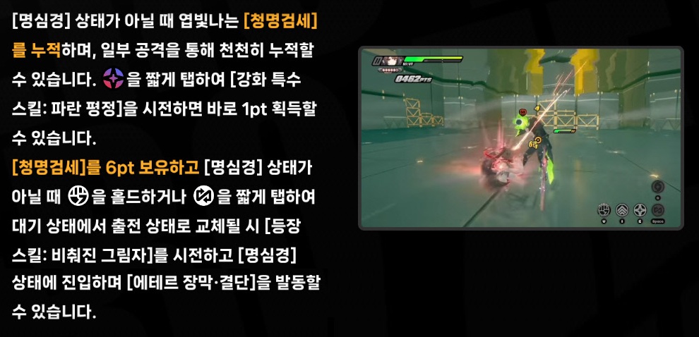 - 스킬 시전 후 [청명검세]를 보유한 상태에서 충전된 특수 스킬 버튼을 짧게 탭하면 [청명검세]를 1pt 소모하고 [강화 특수 스킬: 명심경·섬광]을 시전할 수 있다.