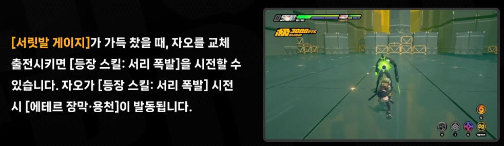 - [서릿발 게이지]가 가득 찼을 때 교전 상태인 경우, 자오를 교체 출전시키면 [등장 스킬]을 시전할 수 있다.