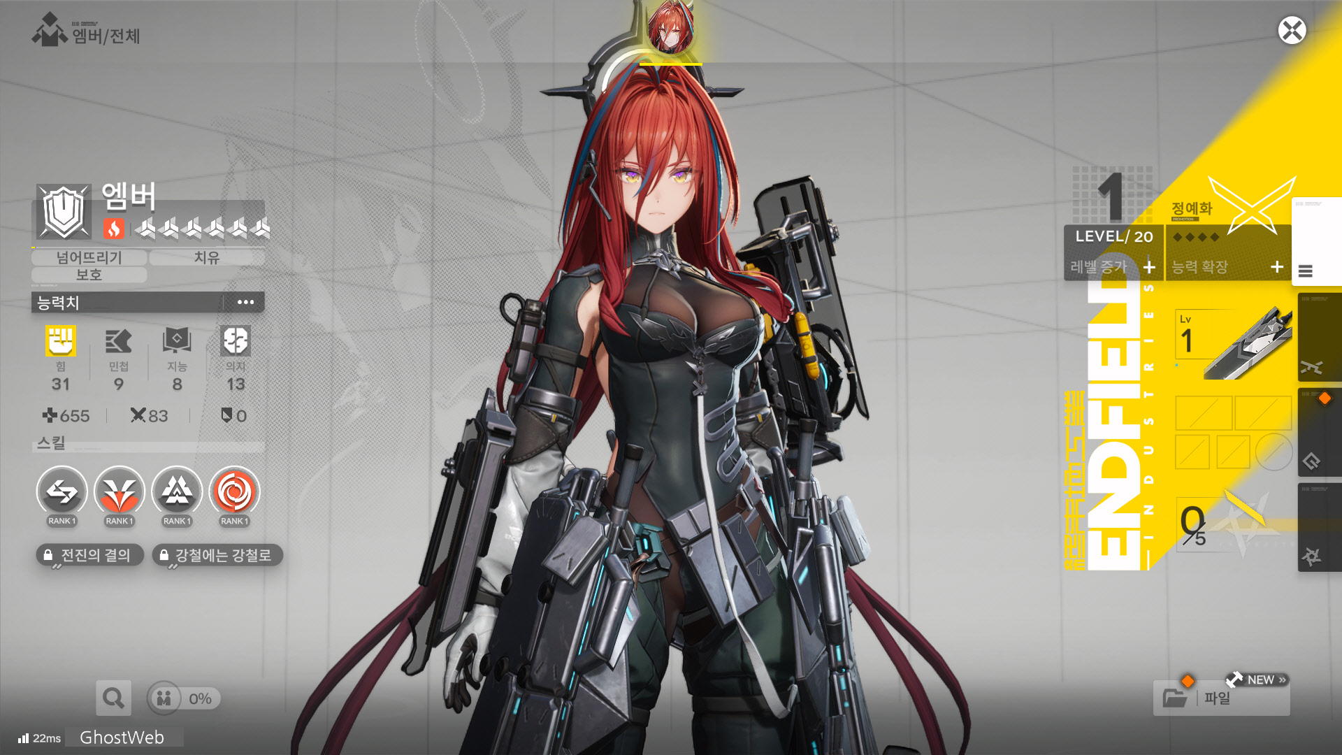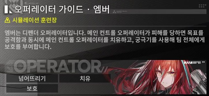 엠버는 디펜도 오퍼레이터로 메인 컨트롤 오퍼레이터가 피해를 당하면 목표를 공격해요.