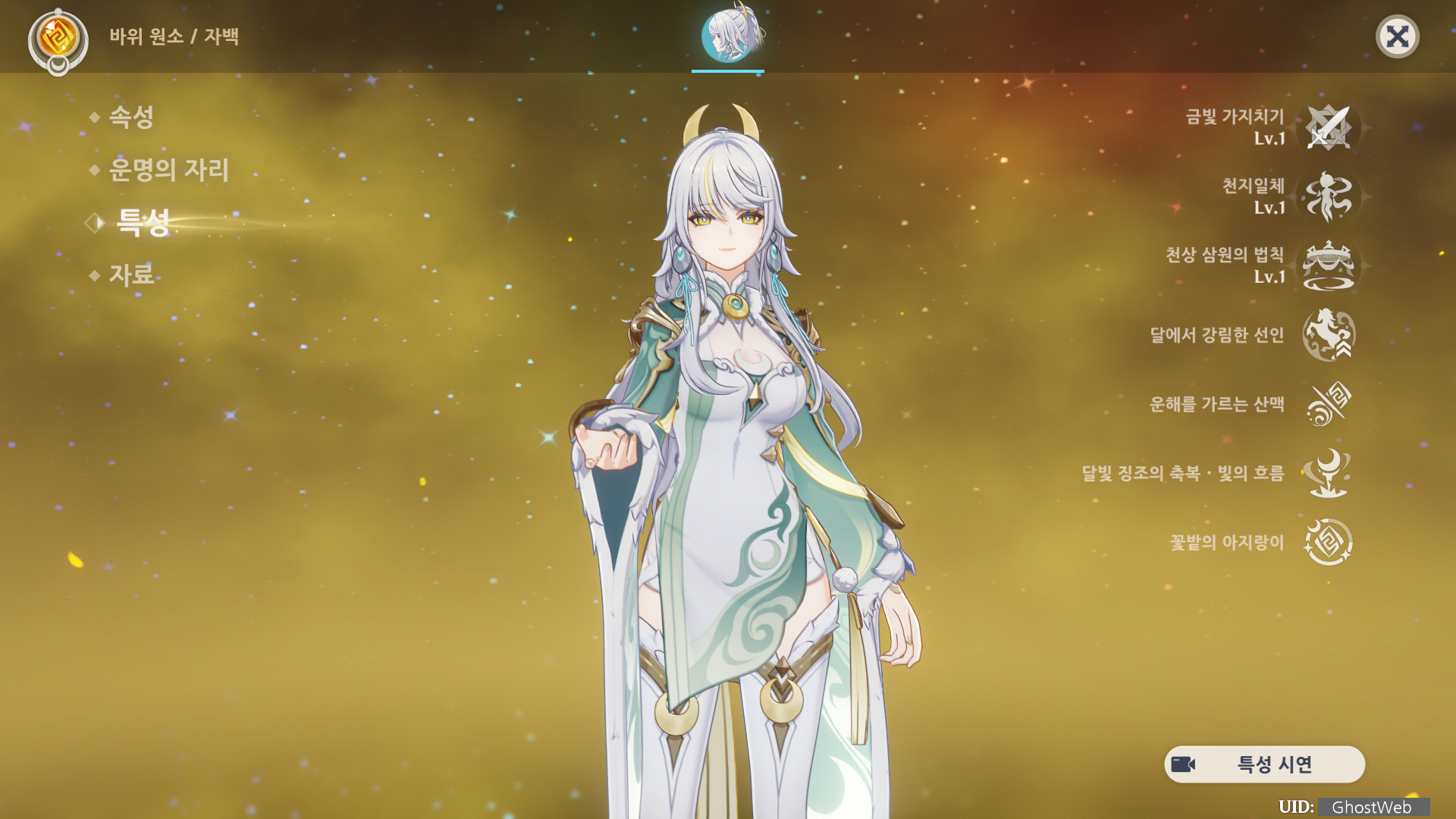 - 해당 효과는 돌파 특성 달에서 강림한 선인을 해금해야 한다.