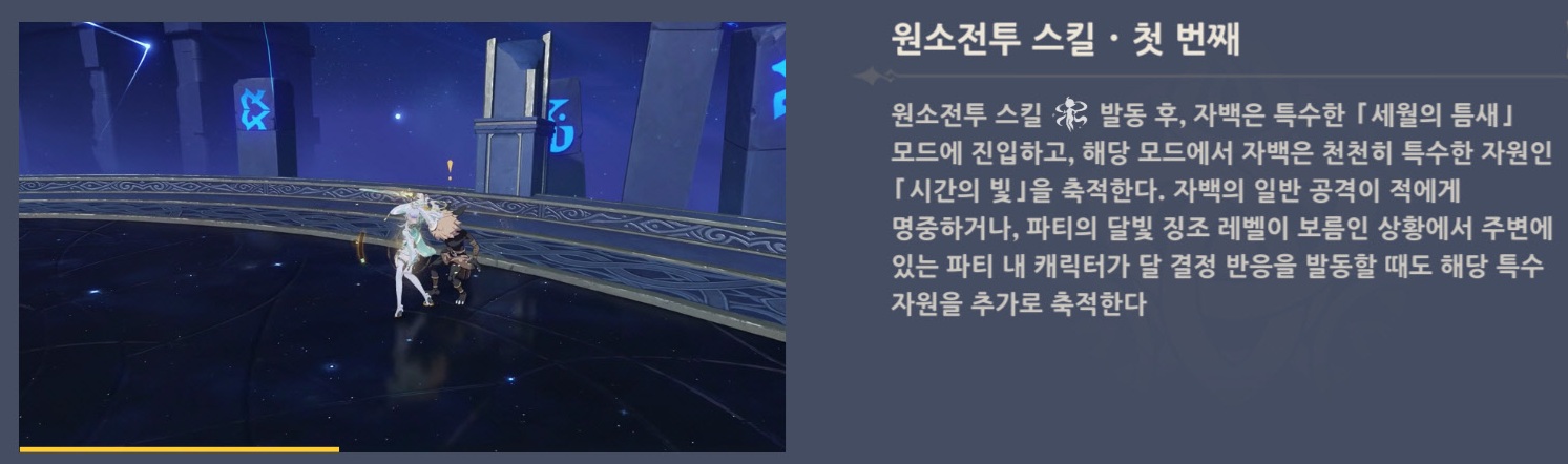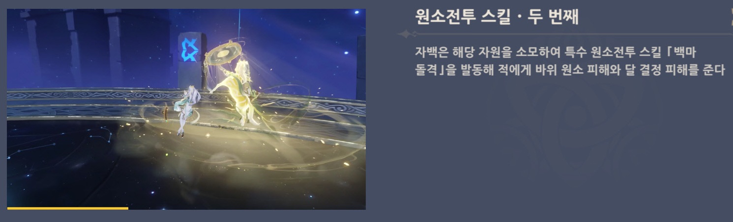 - 자백은 시간의 빛을 소모해 특수한 원소전투 스킬 백마 돌격을 발동할 수 있다.