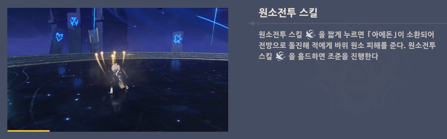 - 아에돈이 전방의 적을 향해 돌진해 닿은 적에게 바위 원소 피해를 준다.