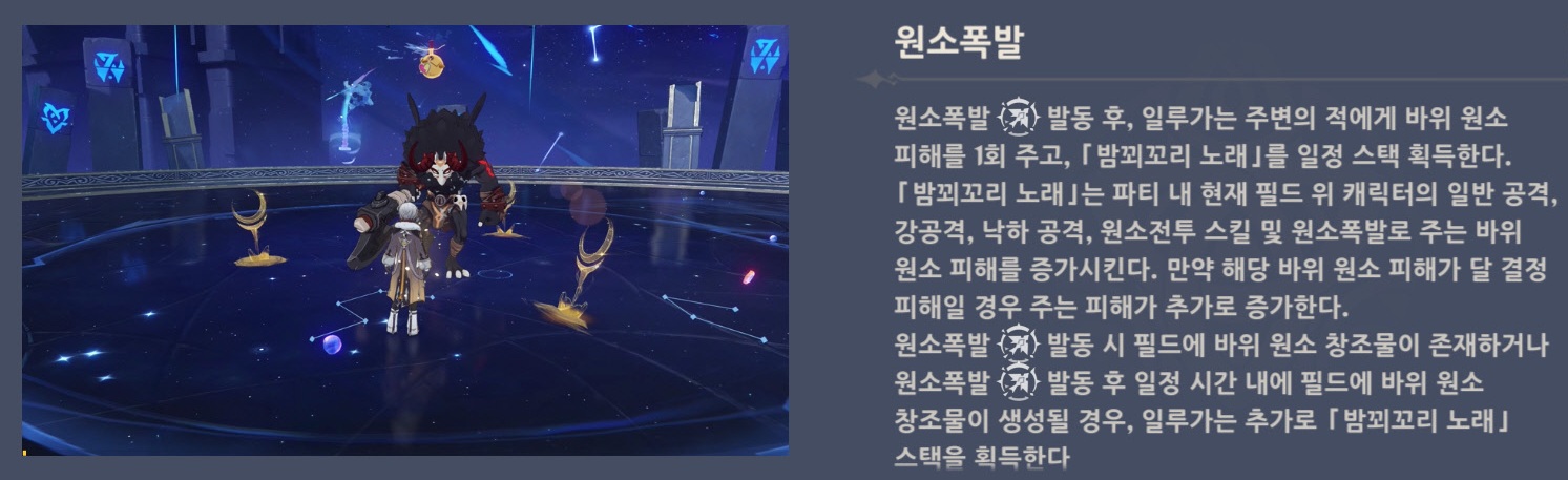 - 상술한 방식으로 준 바위 원소 피해가 동시에 여러 적에게 명중 시, 명중한 적의 수에 따라 밤꾀꼬리 노래 스택을 소모한다.