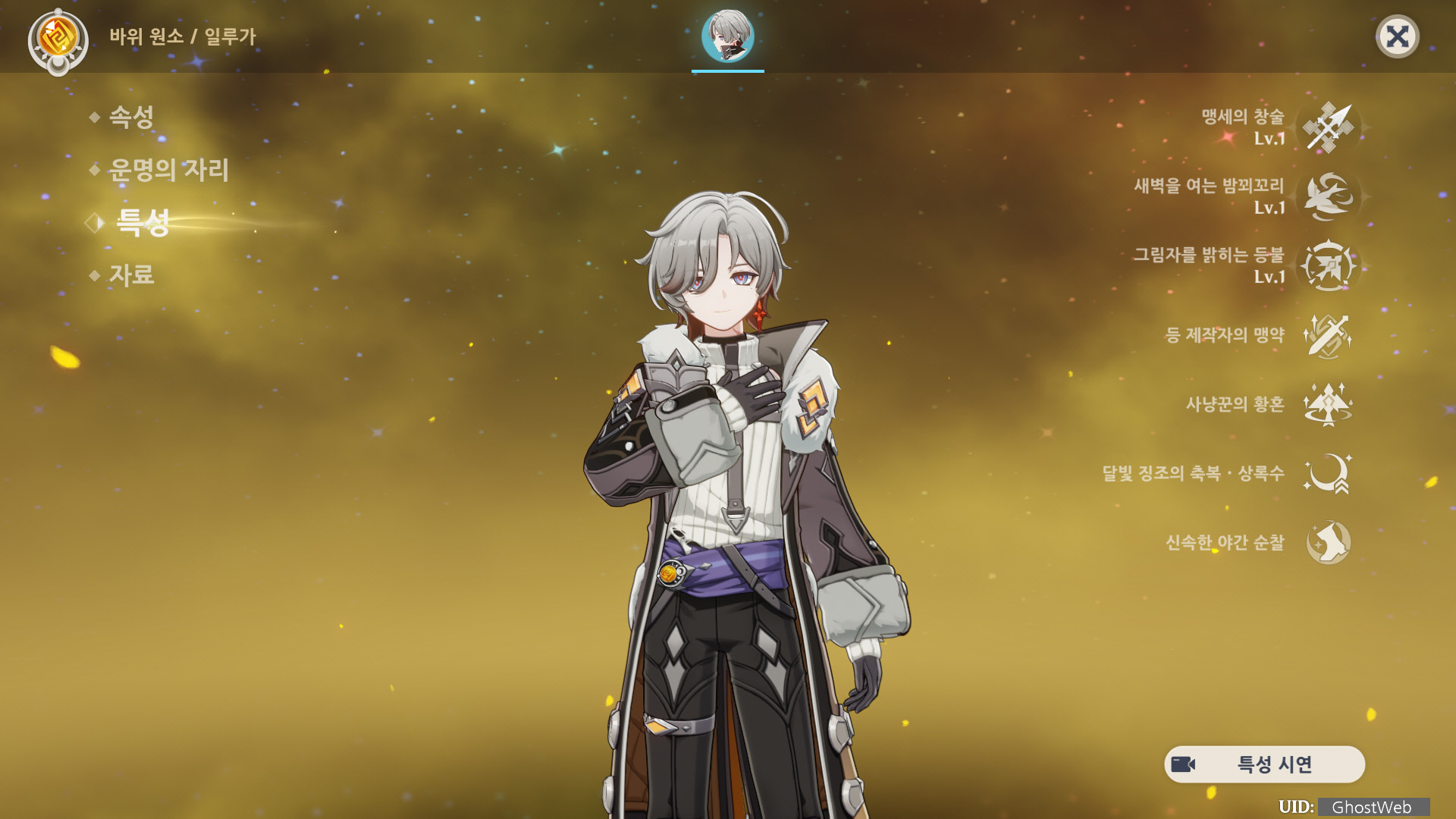 - 매번 원소폭발 발동 후 20초 동안 일루가는 해당 방식으로 밤꾀꼬리 노래를 추가로 최대 15스택 획득할 수 있다.