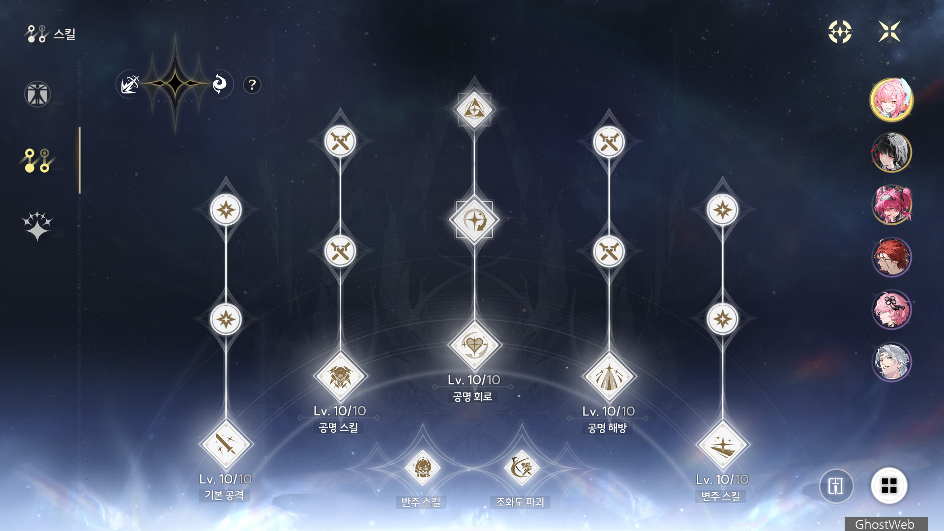 | 3 | 침묵 속에 처음처럼 타오르는 불꽃 | 공명 해방 경계를 부순 별빛 · 종결의 피해 배율이 100% 상승된다. 공명 해방 경계를 부순 별빛 · 과부하의 피해 배율이 40% 상승된다. 즉시 대응 상태일 경우, 강공격 · 에이메스, 강공격 · 메카스카우트 발동 시, 자신이 처해있는 공명 모드 · 조화 파동 / 공명 모드 · 불꽃에 따라 주변 목표에게 조화 파동 · 이탈 / 불꽃 효과를 추가한다. 고유 스킬 별과 별 사이가 다음과 같은 효과로 대체된다. - 공명 모드 · 조화 파동에 있을 경우, 파티 내 캐릭터가 조화 파동 · 이탈을 추가하거나 혹은 조화 파동 피해를 입힐 시, 에이메스의 크리티컬 피해가 60% 증가되고, 공명 해방 경계를 부순 별빛 · 종결의 피해가 25% 부스트된다. - 캐릭터가 파티에 편성되거나 모드 전환 시, 해당 효과가 리셋된다. - 공명 모드 · 불꽃에 있을 경우, 파티 내 캐릭터가 불꽃 효과 추가 시, 에이메스의 크리티컬 피해가 60% 증가되고, 공명 해방 경계를 부순 별빛 · 종결의 피해가 25% 부스트된다. - 캐릭터가 파티에 편성되거나 모드 전환 시, 해당 효과가 리셋된다. |