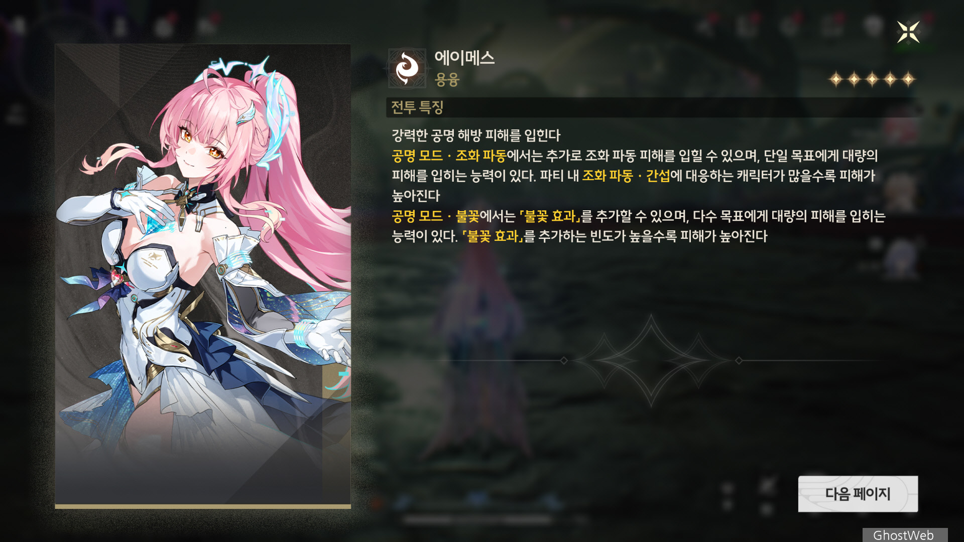 - 공명 모드 · 조화 파동에 있을 시, 에이메스를 제외한 파티 내 캐릭터의 전체 피해가 10% 부스트되고, 20초간 지속된다.