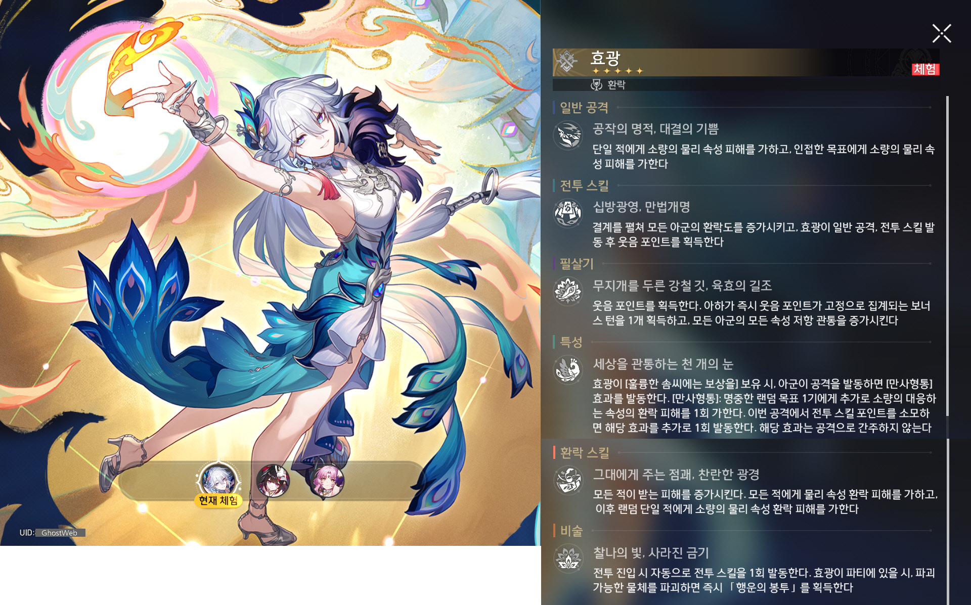 | 4 | 비단 같은 운명, 깃으로 찍어낸 색채 | 효광의 필살기로 발동한 아하의 보너스 턴 동안, 모든 아군 캐릭터의 환락 스킬이 가하는 피해가 기존 피해의 150%가 된다. |