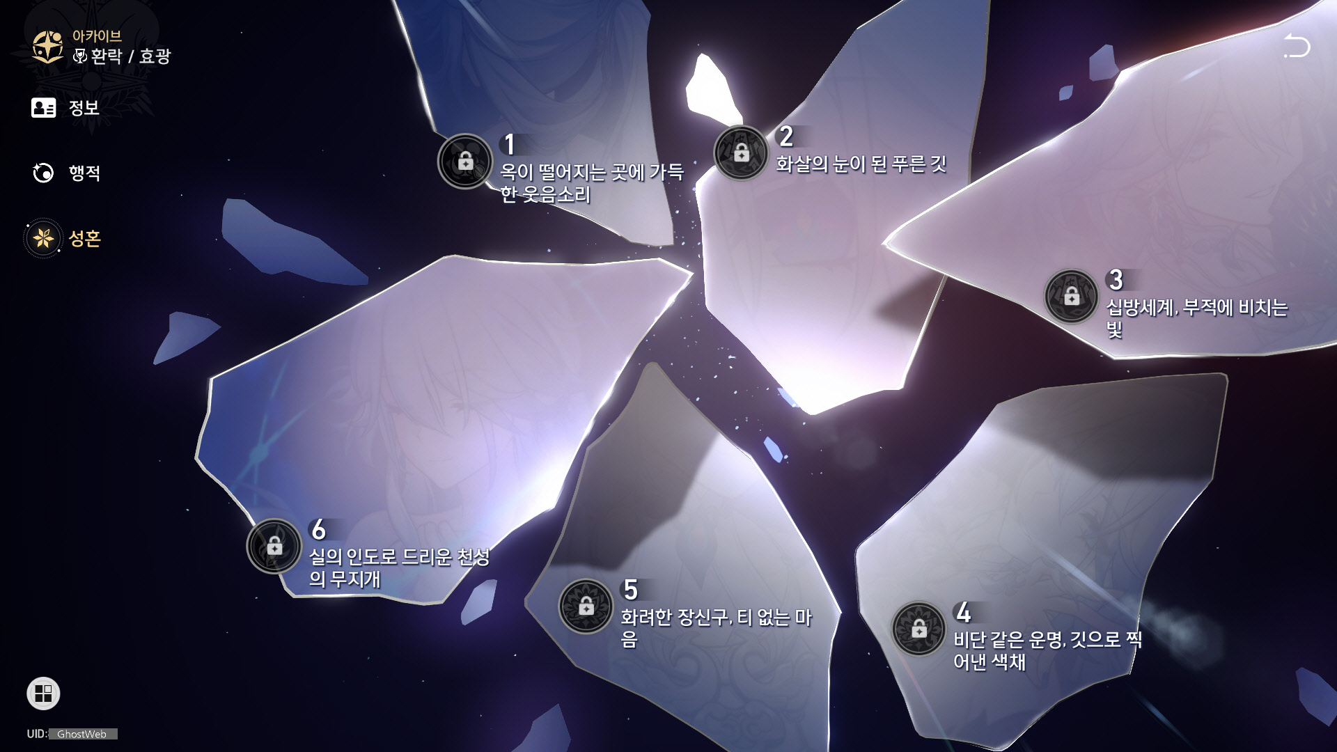 | 6 | 실의 인도로 드리운 천선의 무지개 | 모든 아군의 환락 피해가 25% 증소한다. 효광 환락 스킬의 피해 배율이 기존 배율의 100%만큼 증가한다. |