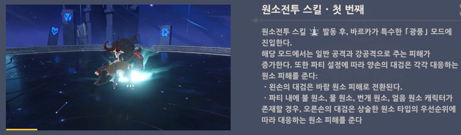 - 광풍 모드에서 바르카의 일반 공격과 강공격으로 주는 피해가 증가하고 낙하 공격을 할 수 없다.