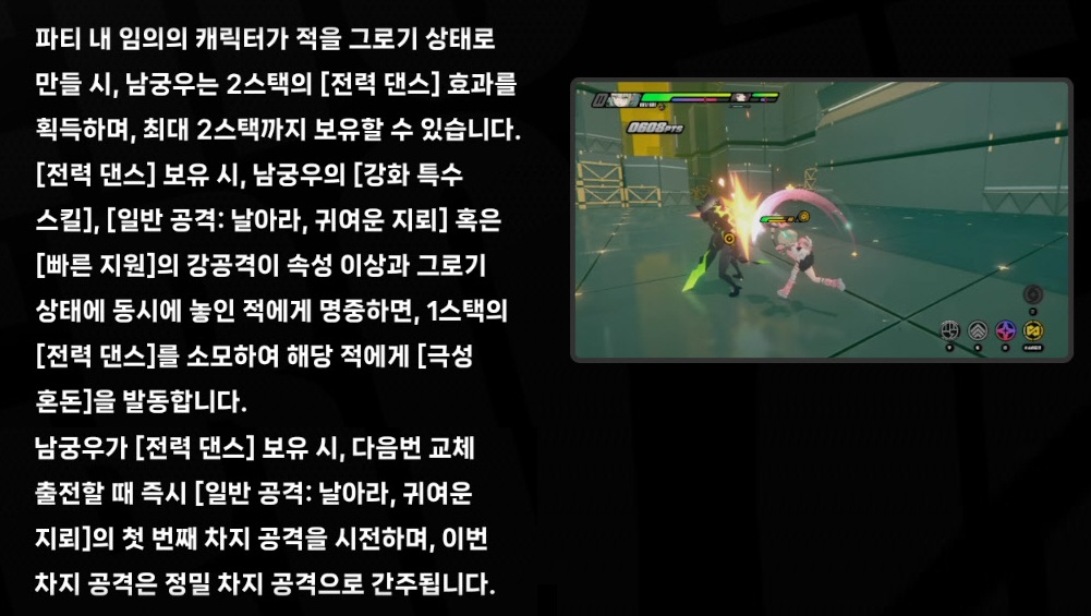 - 만약 해당 스킬로 [극성 혼돈]이 발동하지 않으면, [전력 댄스]를 소모하지 않고, 남궁우가 [전력 댄스] 보유 시 다음번에 교체 진입할 때 [일반 공격: 날아라, 귀여운 지뢰] 첫 번째 차지 공격을 시전하며 반드시 정밀 차지를 발동한다.