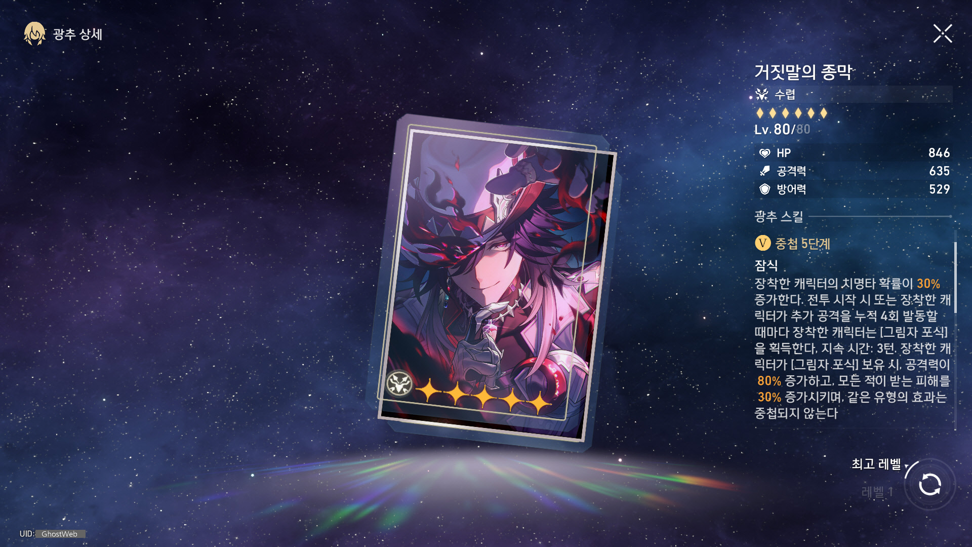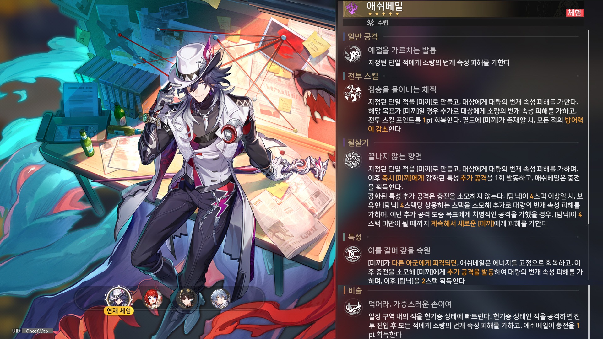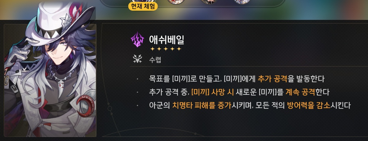 | 4 | 명심, 진상을 곱씹을 필요 없이 | 애쉬베일이 필살기 발동 시 공격력이 40% 증가한다. (지속 시간: 3턴) |