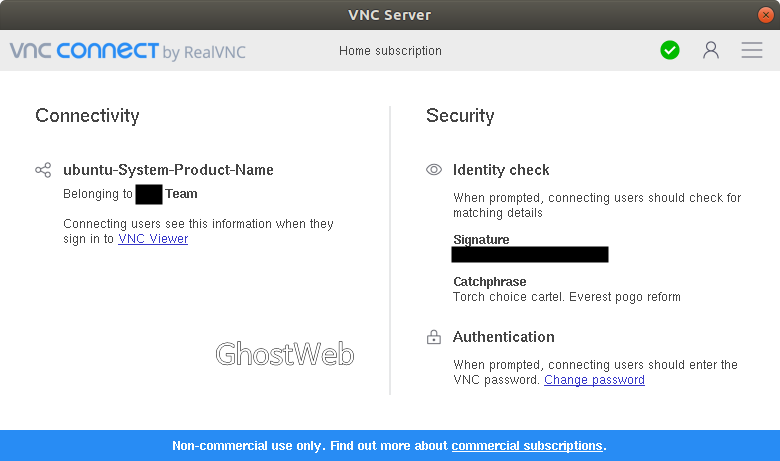 계정 활성화가 되면 다음과 같이 x 표가 사라지고 v가 체크된 모습과 해당 PC의 VNC 정보를 볼 수 있어요.