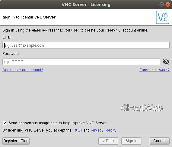 Licensing을 누르면 제일 먼저 VNC 계정과 비밀번호를 넣은 다음 아래의 Sign in 버튼을 클릭하세요.