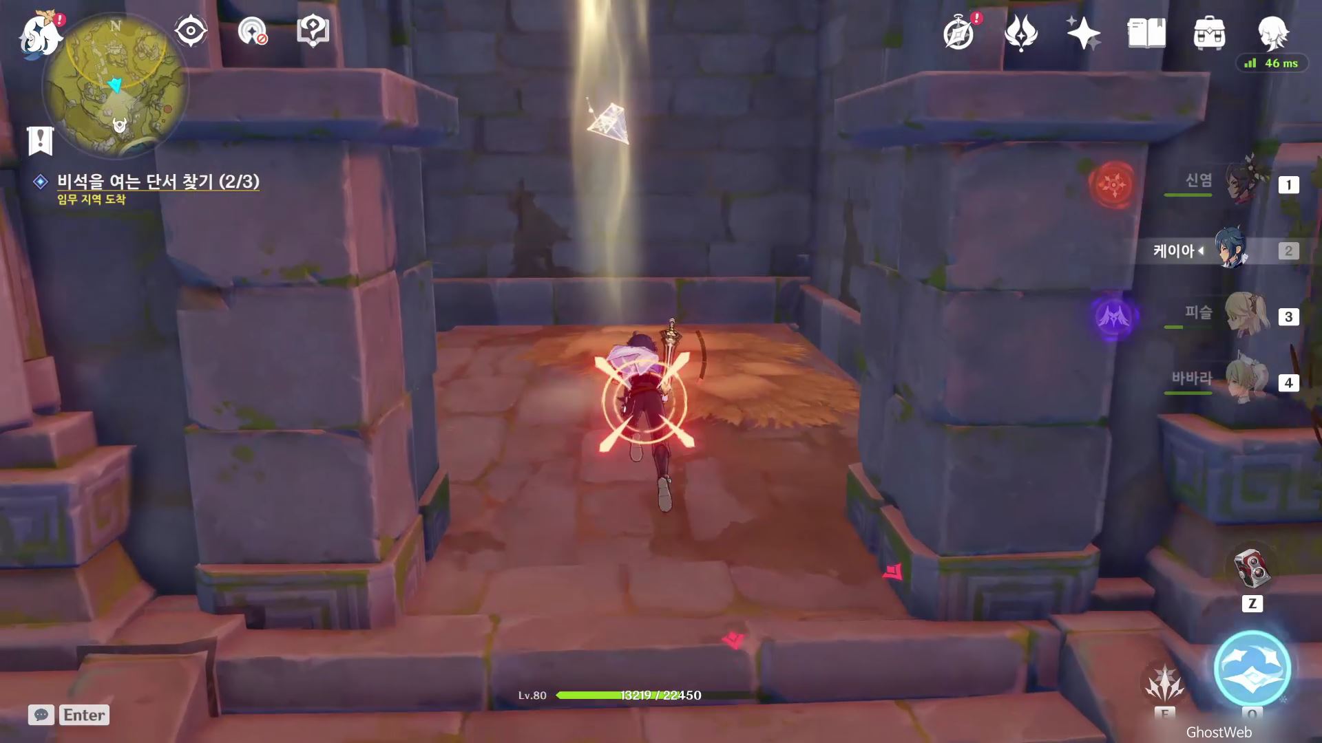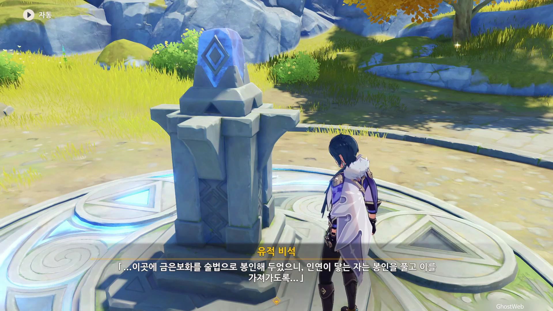 유적 비석 기준 지도 상 6시 방향에 있는 유적지로 가서 주변에 있는 빛나는 광석을 파괴하여 빛을 얻은 후 유적지 2층, 3층에 있는 2개의 석등에 다가가 등을 점등 시키면 돼요.